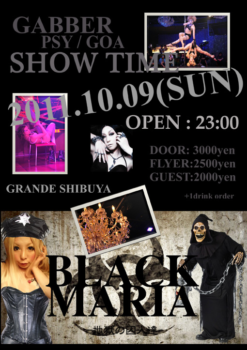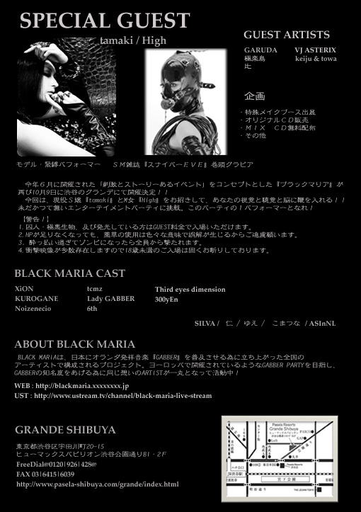 今年6月に開催された「刺激とストーリーあるイベント」をコンセプトとしたパーティ『BLACK MARIA』が再び10月9日に渋谷のグランデにて開催決定!!今回は、スナイパーEVEの巻頭をかざった現役モデル・緊縛パフォーマーのS嬢『tamaki』とM女『High』をお招きして、あなたの視覚と聴覚と脳に鞭を入れる!!!!また特別ハロウィン前企画として、特殊メイクブースを設置。会場で闇の施術が・・・未だかつて無いエンターテイメントパーティに挑戦。このパーティの1パフォーマーとなれ!!